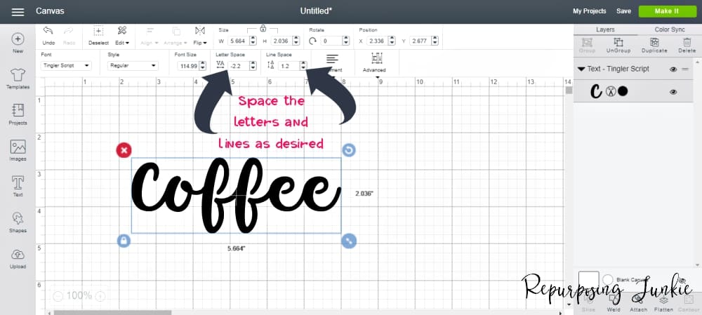 Since I’m working with a script font here I want the letters to be connected as one continuous word, so I chose to narrow the spacing between the letters until they were connected.